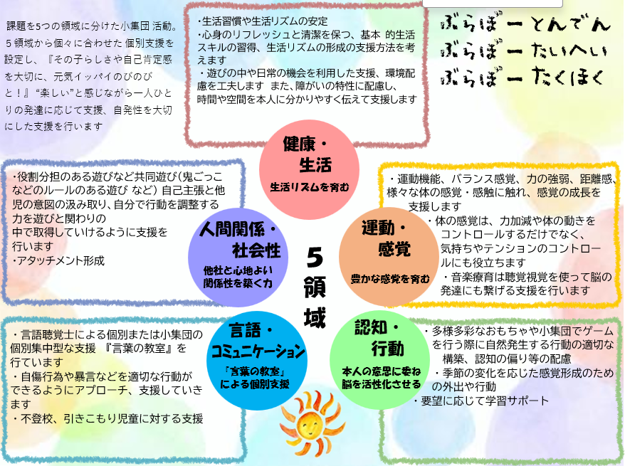 児童発達支援・放課後等デイサービス 札幌ブラボーカンパニーでは5領域をふまえた総合的な支援を実施しております。 令和6年度から児童発達支援・放課後等デイサービスの支援の提供する支援の見える化を図ることを目的として、新たに5領域(「健康・生活」「運動・感覚」「認知・行動」「言語・コミュニケーション」「人間関係・社会性」)との関係性を明確に示した支援計画を作成し公表する必要があります